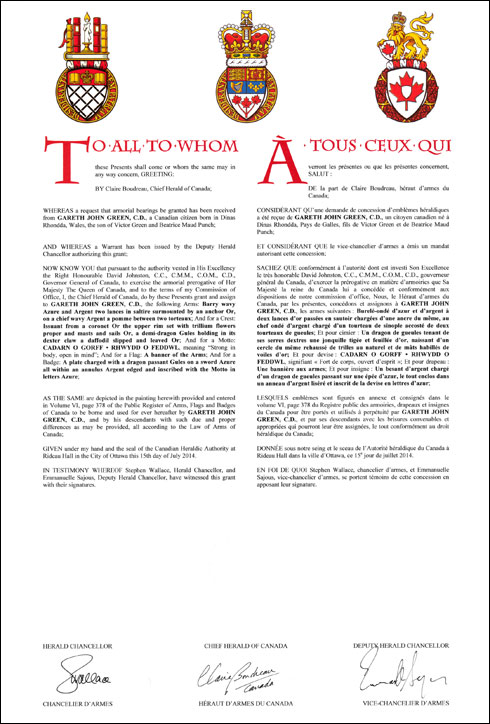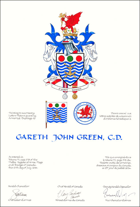 CrestBlazonIssuant from a coronet Or the upper rim set with trillium flowers proper and masts and sails Or, a demi-dragon Gules holding in its dexter claw a daffodil slipped and leaved Or; SymbolismThe dragon and daffodil evoke Wales, the land of Mr. Green’s birth. The coronet of trillium flowers and sails symbolizes his residence in Ontario and avocation for the sea. |