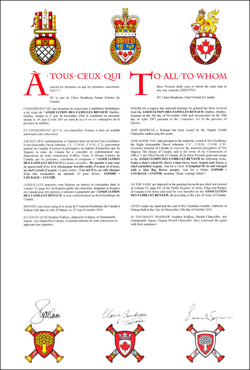 CrestBlazonA lymphad Or its sail charged with a blue flag flower proper; SymbolismThe ship recalls the mode of transportation used to reach New France. Its unfurled sails convey the hope that the Renaud ancestors placed in this migration. The blue flag iris, Quebec’s provincial flower, represents the province where most Renauds live today. |