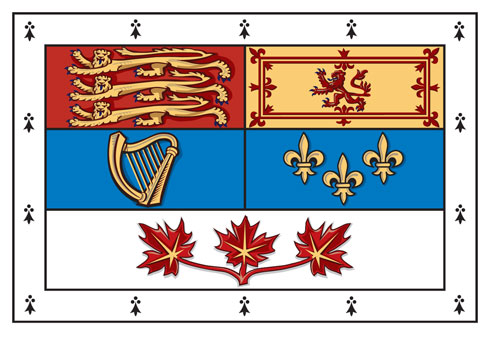 Flag for Members of the Royal Family for use in CanadaBlazonA banner of the Arms of Her Majesty The Queen in Right of Canada within a bordure Ermine; SymbolismThis flag is based on Her Majesty The Queen’s personal flag for use in Canada, and uses the Royal Arms of Canada, in banner form, as its basis.The ermine border, a feature of a similar flag in the United Kingdom, indicates that the person does not have a personal flag created for use in Canada. |