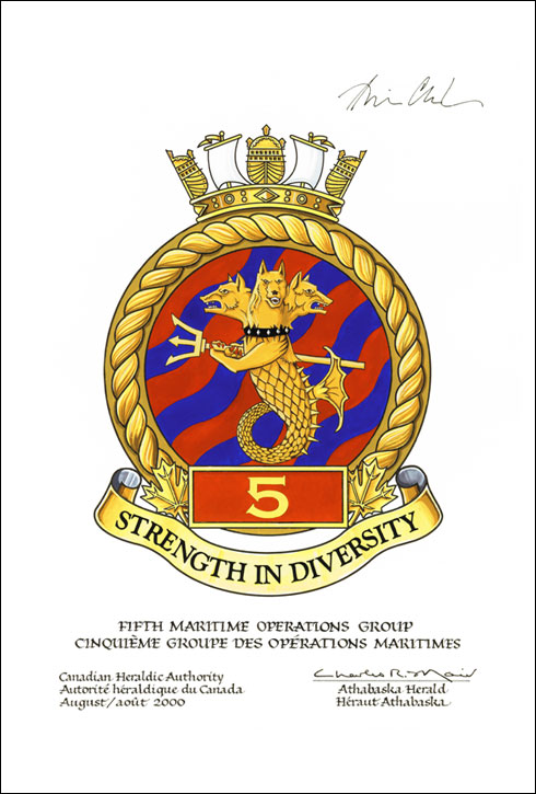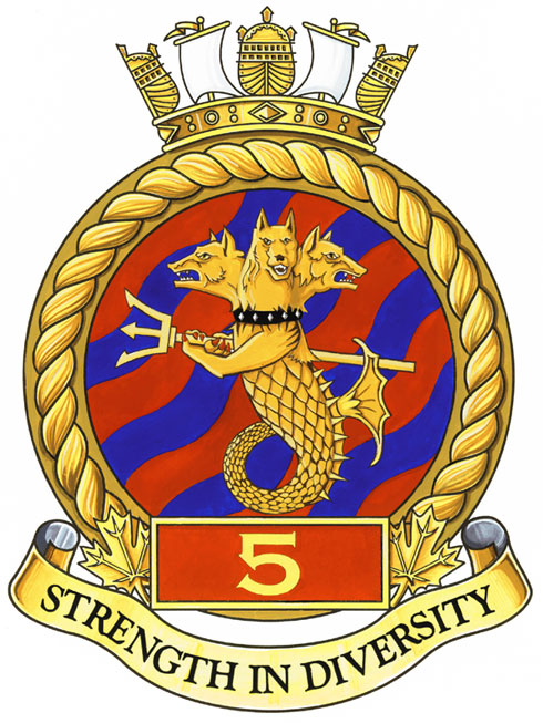 Badge of the Fifth Maritime Operations GroupBlazonGules four bendlets reversed wavy Azure a sea Cerberus Or gorged of a collar Sable garnished Argent holding under the dexter arm a trident Or fesswise; SymbolismThe field represents the naval environment. Its colours have a double meaning; the first is the various waters in which the Group's elements are operating: blue for the deep waters where submarines and Naval Control of Shipping operate, and red for the littoral waters where Harbour Defence, Divers and Maritime Coastal Defence Vessels operate. The second meaning is the bilingual aspect of the Group's elements and personnel. In Greek and Roman mythologies, Cerberus is the three-headed dog guarding the underworld. This monster represents the Group's main mission to guard the East Coast of Canada. It has been transformed into a sea monster to better represent the naval aspect of the Group. |