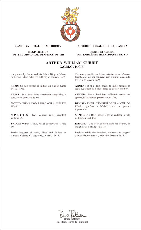 The contents of this Register are intended for research purposes only. The heraldic emblems found in the Register may not be reproduced in any form or in any media without the written consent of the Canadian Heraldic Authority and/or the recipient.