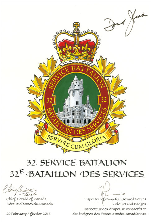 Additional InformationCreator(s)Original concept of the 25 (Toronto) Service Battalion (1983) and the 32 Service Battalion, assisted by the heralds of the Canadian Heraldic Authority. PainterRobert Grey CalligrapherShirley Mangione Recipient TypeMilitary Institution |