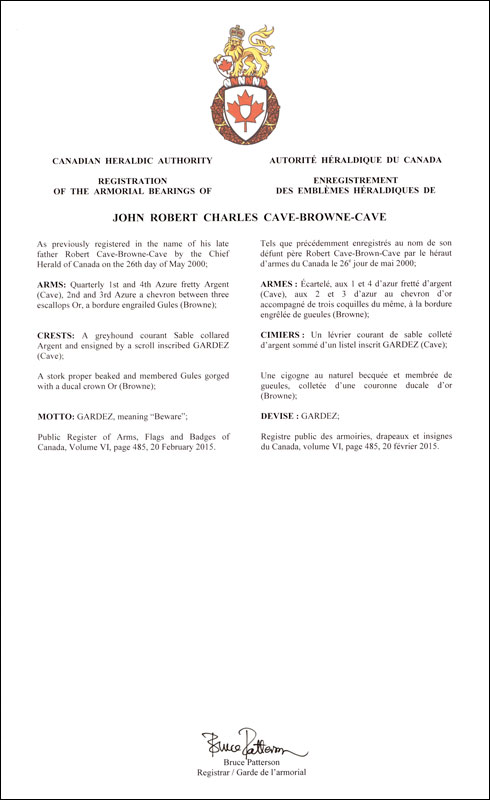 The contents of this Register are intended for research purposes only. The heraldic emblems found in the Register may not be reproduced in any form or in any media without the written consent of the Canadian Heraldic Authority and/or the recipient.