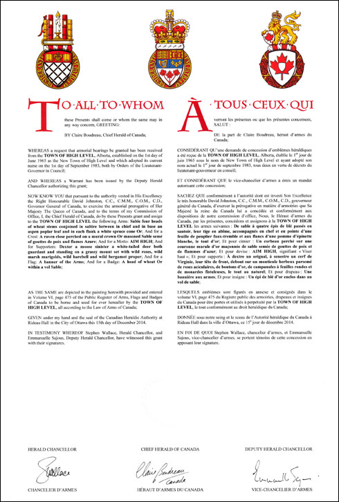 Arms of Town of High LevelBlazonSable four heads of wheat stems conjoined in saltire between in chief and in base an aspen poplar leaf and in each flank a white spruce cone Or; SymbolismThe black field represents the petroleum wealth that contributed to the development and prosperity of High Level. The wheat stalks, poplar aspen leaves and spruce cones symbolize the region’s forests and meadows, as well as forestry and agriculture, which are the staples of the traditional economy. The wheat stalks are placed in an X shape as a reminder that the town is located at a crossroads. |