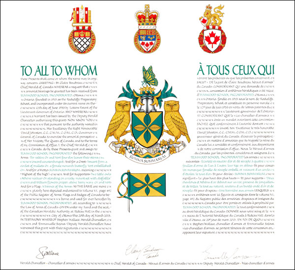 SupportersBlazonTwo little owls (Athene noctua) Or standing on a rocky mount set with daffodils and trillium flowers proper, above barry wavy Or and Vert; SymbolismThe owls evoke wisdom, intelligence, knowledge and strength. They are also the attribute of Athena, the Greek goddess of the arts, craft and skills. The rocky mount evokes Rockcliffe Park, where the school is located, and the nearby Ottawa River is represented by the waves beneath the mount. The daffodil is the school emblem and it was chosen by Theodora Philpot, the school’s founder. It signifies rebirth and the resilience of nature by heralding the spring every year. Mrs. Philpot was inspired by a poem by William Wordsworth, “I wandered lonely as a cloud,” also known as “The Daffodils”. In amongst the daffodils are trilliums, the official flower of Ontario. |
