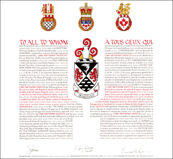 Additional InformationCreator(s)Original concept of Emanuele Saputo, Giordano Saputo and Bruce Patterson, Deputy Chief Herald of Canada, assisted by the heralds of the Canadian Heraldic Authority. PainterIlona Jurkiewicz CalligrapherMyriam Chesseboeuf Recipient TypeIndividual |