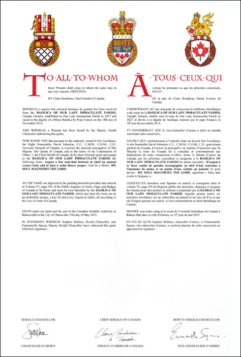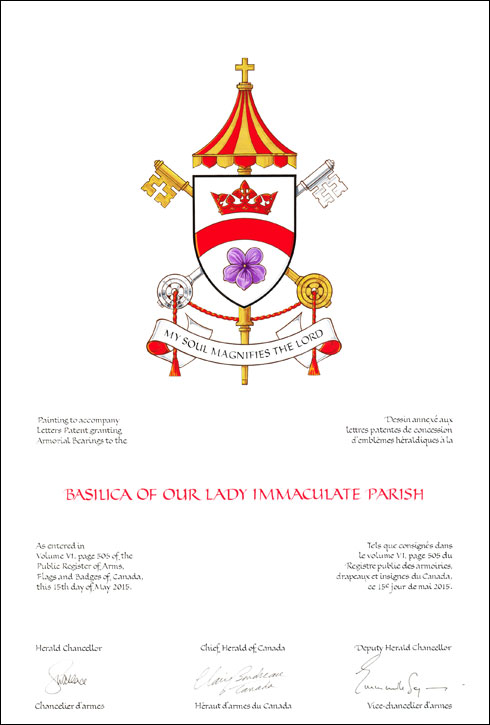Arms of Basilica of Our Lady Immaculate ParishBlazonArgent a fess enarched between in chief an ancient crown Gules and in base a violet flower proper; SymbolismWhite is a colour symbolizing purity. The ancient crown alludes to the one that appears in the arms of the City of Guelph, and in this position also alludes to the Virgin Mary’s title of “Queen of Heaven”. The arch refers to the fact that the church building is known as “the church on the hill”. The violet, a Marian symbol, represents the heart of the church, and, with the colour for purity, refers to the Immaculate Conception. |
