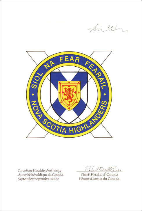 Badge of The Nova Scotia HighlandersBlazonA saltire Argent surmounted by the shield of Arms of the Province of Nova Scotia (Argent on a saltire Azure an escutcheon of the Royal Arms of Scotland) encircled by an annulus Azure fimbriated and inscribed above with the motto SIOL NA FEAR FEARAIL and below with the designation NOVA SCOTIA HIGHLANDERS in letters Or; SymbolismThe saltire refers to St. Andrew, patron saint of Scotland, while the Arms of Nova Scotia refer to the regiment's home in that province. |