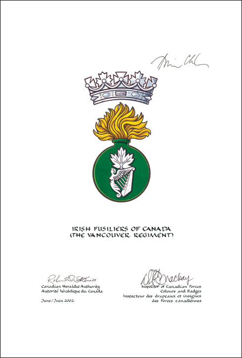 Badge of the Irish Fusiliers of Canada (The Vancouver Regiment)BlazonOn a grenade Vert enflamed Or a harp surmounted by a maple leaf all ensigned by the coronet of a grandchild of the Sovereign Argent; SymbolismThe grenade enflamed is a traditional symbol for fusiliers. The harp and green represent Ireland; the maple leaf, Canada. The coronet refers to the Princess (later Queen) Victoria who presented colours to the predecessor regiment in Britain in 1833. |