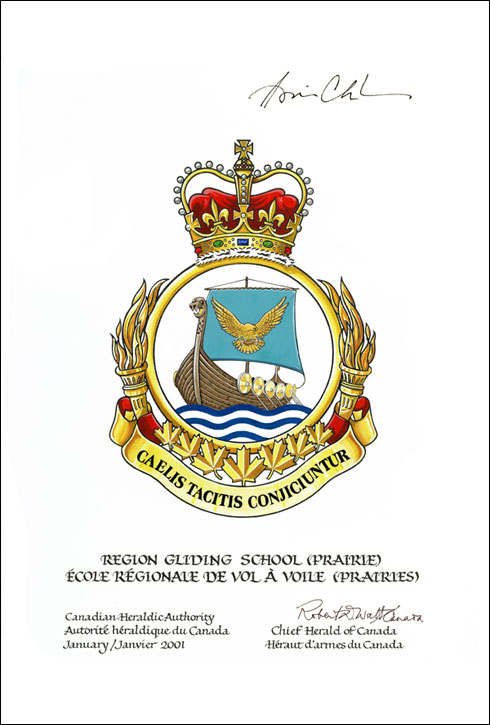 Badge of the Region Gliding School (Prairie)BlazonArgent a Viking long ship in trian aspect oars in action proper shields Or flying a sail Bleu-Celeste charged with an eagle volant affronté head to the sinister Or in base three bars wavy Azure; SymbolismThe badge shows a Viking long ship under sail, the sail itself of sky blue and featuring an eagle in flight. The long ship is a reference to the badge of former CFB Gimli, which was within a settlement founded by Icelandic Canadians and thus honours their heritage. The Gliding School badge is made distinctive through the colouring of the sail, the orientation of the ship and the use of the eagle for flight. |