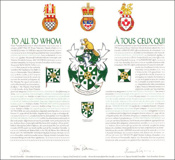 Additional InformationCreator(s)Original concept of Bruce Patterson, Deputy Chief Herald of Canada, assisted by the heralds of the Canadian Heraldic Authority. PainterIlona Jurkiewicz CalligrapherShirley Mangione Recipient TypeIndividual |