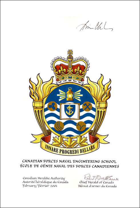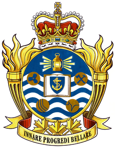 Badge of the Canadian Forces Naval Engineering SchoolBlazonAzure on five bars wavy Argent abaised an open book Argent bound Or charged with an escutcheon Azure bearing a fouled anchor Or, the book encircled in base by four bezants, charged from dexter to sinister with a propeller, three lines in the form of a hull, a signal trace, and an axe and hammer in saltire, all Azure, and in chief a ship's lantern proper irradiated Or; SymbolismThe five wavy bars represent the five training divisions which sustain naval engineering. The ship's lantern symbolizes a naval version of the lamp of knowledge with the rays referring to the outward spread of knowledge, also represented by the book on which is placed the classic naval symbol, the anchor. The School's scope of expertise is highlighted by the symbols on the gold circles: marine systems (propeller), naval architecture (ship's hull forms), combat systems (signal trace), and naval construction (axe and hammer). |
