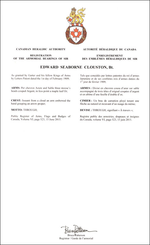 Arms of Edward Seaborne Clouston (Photo: McCord Museum, Montreal, P007/A1,2.1)BlazonPer chevron Azure and Sable three moose’s heads couped Argent, in fess point a maple leaf Or; SymbolismNot available. |