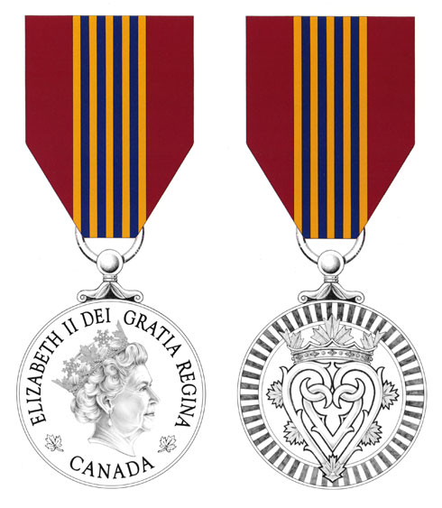 Sovereign’s Medal for VolunteersBlazonSuspended by a claw affixed to a ring from a ribbon Gules bearing a Canadian pale Or charged with four pallets Azure, a medal the obverse bearing a contemporary effigy of Her Majesty The Queen of Canada contourné, wearing a diadem of maple leaves and snowflakes, and environed by the inscriptions ELIZABETH II DEI GRATIA REGINA and CANADA separated by two maple leaves, the reverse a plate rayonné charged with a heart erablé voided ensigned by a coronet erablé and interlaced in fess point with a heart voided, all Argent; SymbolismThe obverse depicts a crowned image of the Sovereign, in whose name the medal is bestowed. The reverse indicates the ideas of caring and generosity, represented by the two hearts. The sunburst pattern of the rim symbolizes the time that volunteers are giving and their actions. Inspired by the Scottish Luckenbooth brooches traded in North America in the 17th century, this design is a modern version of a traditional emblem with roots in Canadian history. The ribbon uses the vice-regal colours of blue and gold, which are taken from the pin of the Governor General’s Caring Canadian Award, which the Sovereign’s Medal for Volunteers has replaced. The five gold stripes evoke the fingers of a hand, present in the Governor General’s Caring Canadian Award emblem. The deep red colour is associated with royalty. |