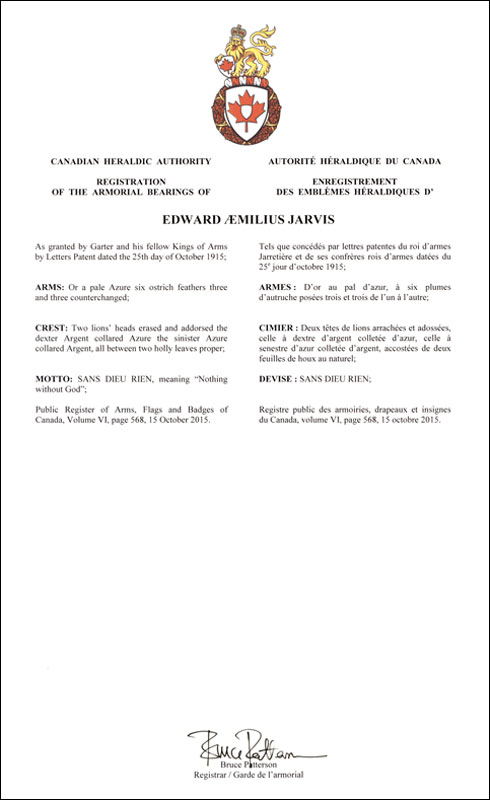 The contents of this Register are intended for research purposes only. The heraldic emblems found in the Register may not be reproduced in any form or in any media without the written consent of the Canadian Heraldic Authority and/or the recipient.