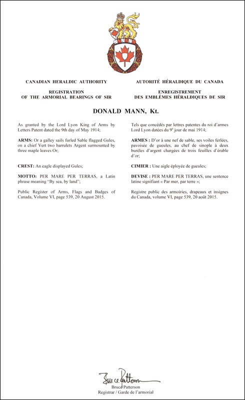 Arms of Donald MannBlazonOr a galley sails furled Sable flagged Gules, on a chief Vert two barrulets Argent surmounted by three maple leaves Or; SymbolismNot available. |