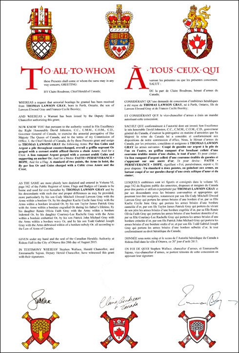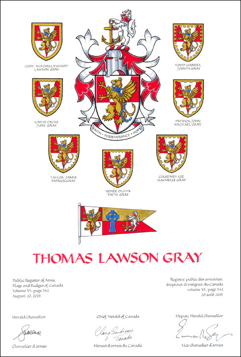 Grant of Arms and Flag, with differences to Cody Mitchell Elwood Lawson Gray, Kaelie Cecile June Gray, Taylor James Patrick Gray, Renée Olivia Faith Gray, Courtney-Lee Rachelle Gray, Patrick John Michael Gray and Todd Gabriel Joseph Gray