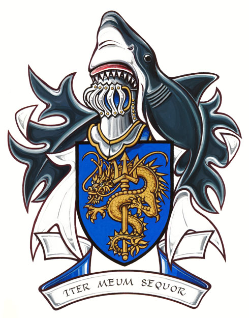 CrestBlazonA great white shark’s head and skin proper engoulant the helmet; SymbolismThe shark recalls Mr. Pannell’s life-long fascination with sharks and his ongoing commitment to their study and conservation. It also alludes to his work as a hedge fund manager in international finance, an industry commonly referred to as being “filled with sharks”. Its position over the helm as a trophy symbolizes Mr. Pannell’s survival instinct and ability to meet and overcome diverse challenges. |