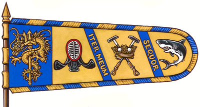 Flag of Ryan Patrick PannellBlazonA standard, the Arms in hoist, the fly Or charged with a kendo men, the Badge and a great white shark embowed proper, all separated by two bends Azure inscribed with the Motto in letters Or; SymbolismThe men, a helmet used in the martial arts kendo, indicates another sporting activity in which Mr. Pannell excels. |