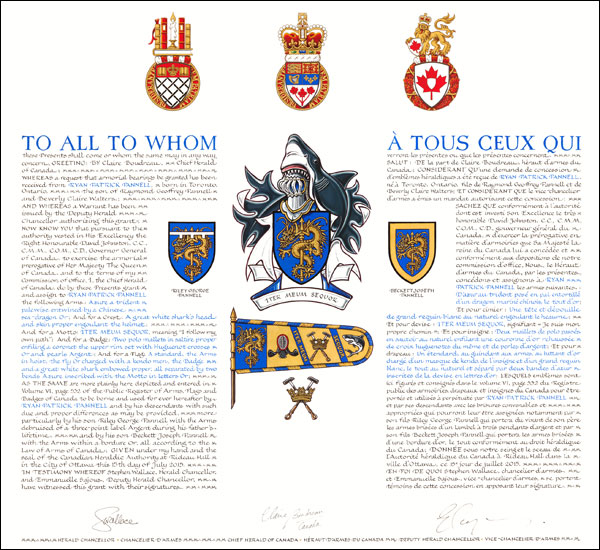 The contents of this Register are intended for research purposes only. The heraldic emblems found in the Register may not be reproduced in any form or in any media without the written consent of the Canadian Heraldic Authority and/or the recipient.