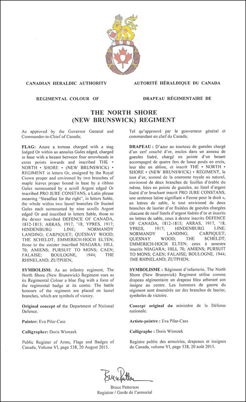 Flag of The North Shore (New Brunswick) RegimentBlazonAzure a torteau charged with a stag lodged Or within an annulus Gules edged, charged in base with a bezant between four arrowheads in cross points inwards and inscribed THE • NORTH • SHORE • (NEW BRUNSWICK) • REGIMENT in letters Or, ensigned by the Royal Crown proper and environed by two branches of maple leaves proper bound in base by a ribbon Gules surmounted by a scroll Argent edged Or inscribed PRO JURE CONSTANS, a Latin phrase meaning “Steadfast for the right”, in letters Sable, the whole within two laurel branches Or fructed Gules each surmounted by nine scrolls Argent edged Or and inscribed in letters Sable, those to the dexter inscribed DEFENCE OF CANADA, 1812-1815; ARRAS, 1917, ’18; YPRES, 1917; HINDENBURG LINE; NORMANDY LANDING; CARPIQUET; QUESNAY WOOD; THE SCHELDT; EMMERICH-HOCH ELTEN; those to the sinister inscribed NIAGARA; HILL 70; AMIENS; PURSUIT TO MONS; CAEN; FALAISE; BOULOGNE, 1944; THE RHINELAND; ZUTPHEN; SymbolismAs an infantry regiment, The North Shore (New Brunswick) Regiment uses as its Regimental Colour a blue flag with a form of the regimental badge at its centre. The battle honours of the regiment are placed on laurel branches, which are symbols of victory. |