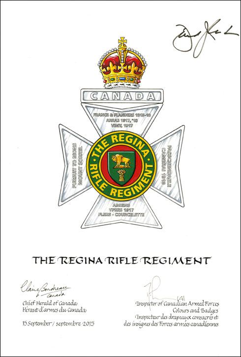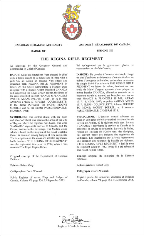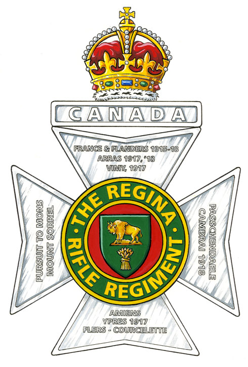 Badge of The Regina Rifle RegimentBlazonGules an escutcheon Vert charged in chief with a bison statant on a mount and in base with a garb Or, all within an annulus Vert edged and inscribed THE REGINA RIFLE REGIMENT in letters Or, the whole surmounting a Maltese cross ensigned with a plaque Argent inscribed CANADA and supporting the Royal Crown proper, the limbs of the cross inscribed in chief FRANCE & FLANDERS 1915-18; ARRAS 1917,’18; VIMY, 1917; in base AMIENS; YPRES 1917; FLERS - COURCELETTE; to the dexter PURSUIT TO MONS; MOUNT SORREL; and to the sinister PASSCHENDAELE; CAMBRAI 1918; SymbolismThe central shield with the bison and sheaf of wheat was used as the arms of the City of Regina, where the regiment was based. The word “CANADA” represents service to Canada, and the Crown, service to the Sovereign. The Maltese cross, which is based on the insignia of the Royal Guelphic Order, is common among badges of rifle regiments. The inscriptions on the cross are selected regimental battle honours. “THE REGINA RIFLE REGIMENT” was the regimental title prior to 1982, when it was renamed The Royal Regina Rifles. |