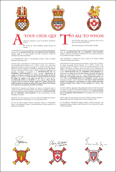 Arms of the Municipalité de la paroisse Saint-MartinBlazonBarry-wavy Vert and Argent a sword Or between two halves of a cape Gules; SymbolismThe wavy bands represent Saint-Martin’s geographic location at the confluence of the Chaudière and Grande Coudée rivers. The sword and cloak are attributes of St. Martin of Tours, after whom the municipality is named. Legend has it that on a cold winter’s day, St. Martin drew his sword, cut his cloak in two and gave one piece to a poor man. |