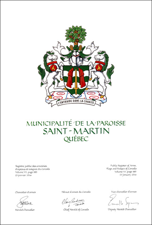 SupportersBlazonTwo horses Argent crined and queued Vert unguled Or, each gorged of a collar pendent therefrom a torteau charged with a flame Or and standing on a hockey rink proper; SymbolismThe horses refer to St. Martin of Tours who, according to legend, was on horseback when he cut his cloak. The fire on their collars represents the flame of knowledge and, by extension, the municipality’s educational mission through its schools and library. The rink symbolizes a meeting place for the citizens of Saint-Martin and in particular hockey, a sport long practised and highly popular in the region. |