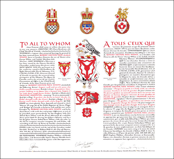 Additional InformationCreator(s)Original concept of Samy Khalid, Saguenay Herald, assisted by the heralds of the Canadian Heraldic Authority. PainterD. Robert Tunstall CalligrapherLuc Saucier Recipient TypeIndividual |