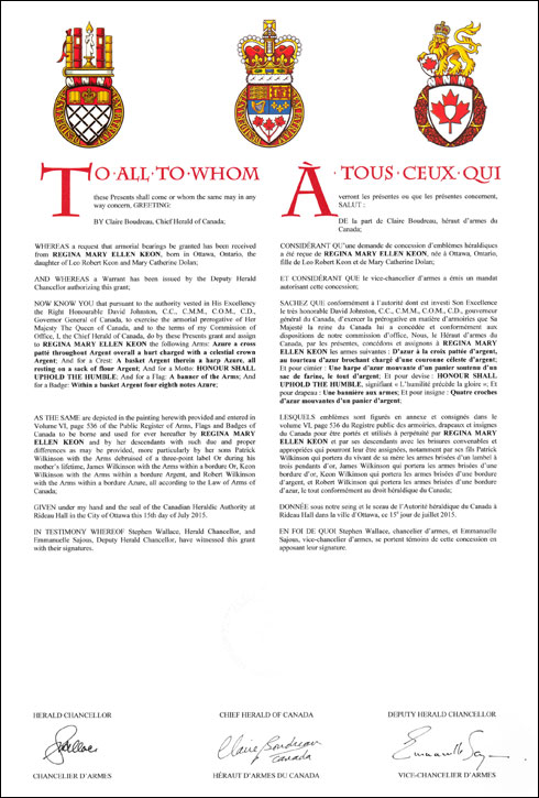 CrestBlazonA basket Argent therein a harp Azure, all resting on a sack of flour Argent; SymbolismThe basket represents the values of generosity and service to others. It pays tribute to Ms. Keon’s father, who would frequently make baskets of food for the less fortunate in his community when he was the owner of the general store of Quyon, Quebec. The sack of flour alludes to the values of caring and selflessness: it recalls the time when her father, as a young man, was saving up for a violin but decided instead to give his savings for flour that was needed by the family. The harp refers to Ms. Keon’s Irish background and to her love of music as a church organist. |