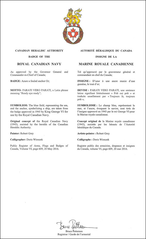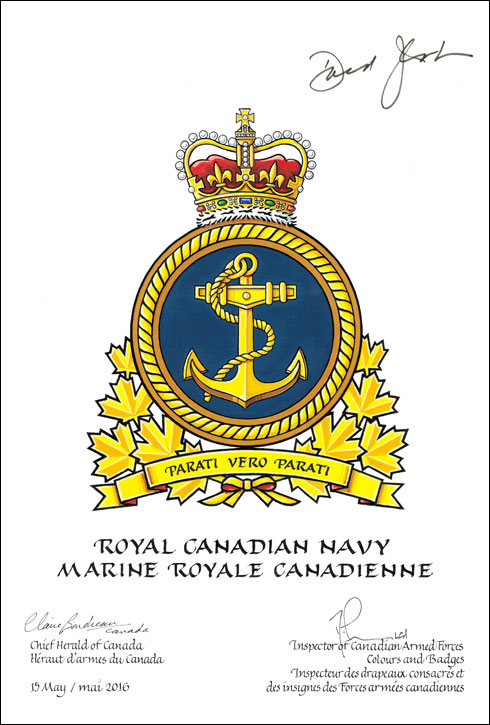 Additional InformationCreator(s)Original concept of the Royal Canadian Navy (1945), assisted by the heralds of the Canadian Heraldic Authority. PainterRobert Grey CalligrapherDoris Wionzek Recipient TypeMilitary Institution |