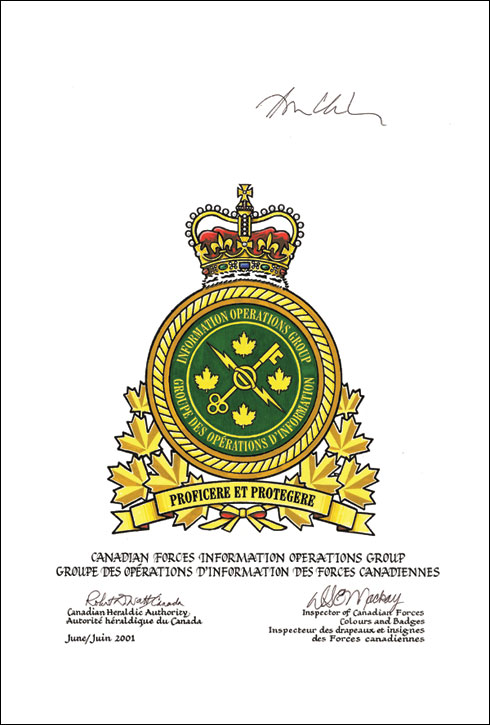 Badge of the Canadian Forces Information Operations GroupBlazonVert between four maple leaves a lightning bolt and a key in saltire, the centre composed of two annulets forming a sphere Or, the whole encircled by an annulus Vert fimbriated and inscribed INFORMATION OPERATIONS GROUP • GROUPE DES OPÉRATIONS D'INFORMATION in letters Or; SymbolismThe maple leaves represent the Canadian Forces and the fact that information is received from and sent in all directions. The green field denotes the early days of the unified Canadian Forces. The key symbolizes protection of information, while the lightning bolt represents communication and electronic warfare. The device at the centre is composed of two circles from a goniometer, which represents the original supplementary radio system. |