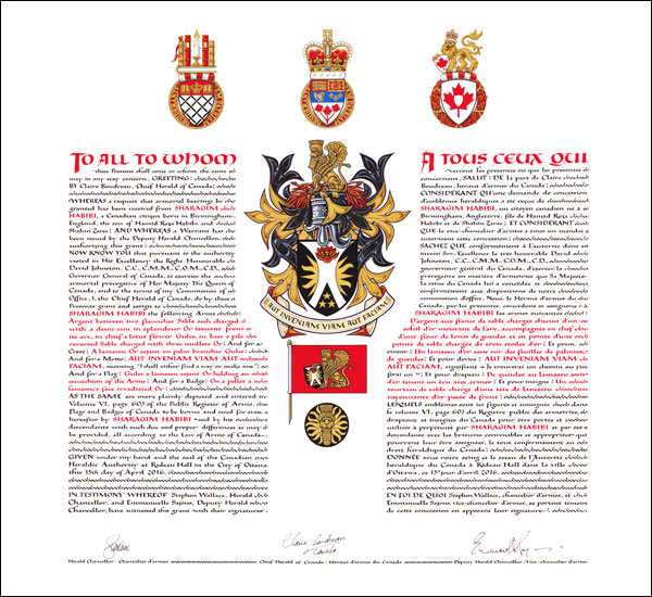 Additional InformationCreator(s)Original concept of Samy Khalid, Saguenay Herald, assisted by the heralds of the Canadian Heraldic Authority. PainterEva Pilar-Cass CalligrapherLuc Saucier Recipient TypeIndividual |