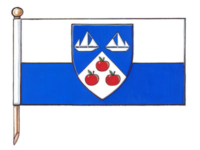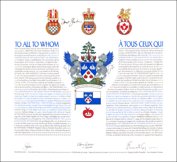 Arms of The Corporation of the Municipality of MeafordBlazonPer chevron Azure and Argent, in chief two schooners respectant Argent, in base three apples proper; SymbolismThe division of the shield alludes to the shape of the Municipality of Meaford (in white) with Georgian Bay (in blue) to its north. The schooners refer to shipbuilding and recreational boating. The apples refer to the local apple growing industry. The three of them refer to the three municipalities that came together to form Meaford, namely the Township of St. Vincent, the Township of Sydenham and the Town of Meaford. |