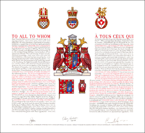 Arms of Osgoode Hall Law School of York UniversityBlazonThe Arms of Osgoode Hall Law School (as registered on this date in Volume VI page 594) within a bordure Gules charged with roses Argent barbed and seeded proper; SymbolismThe design within the border was granted to Osgoode Hall Law School by the English Kings of Arms in 1958. The column, scroll and beaver appear on the seal, from 1823, of the Law Society of Upper Canada, which created and operated Osgoode Hall Law School until 1968. The beaver is a Canadian symbol, and the column represents Magna Carta as being the central pillar of the English legal tradition. The quarter of the shield with millrinds is the coat of arms of Lincoln’s Inn, one of the Inns of Court in London, England, to which William Osgoode, the first Chief Justice of Upper Canada and the school’s namesake, belonged. The quarter of the shield with the pegasus is the arms of the Inner Temple, the Inn of Court to which John White, Upper Canada’s first Attorney General, belonged. The border indicates Osgoode Hall’s affiliation with York University, the coat of arms of which uses a white rose, the royal badge of the House of York, on a red background. |