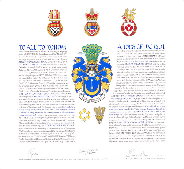 Additional InformationCreator(s)Original concept of Jerzy Franciszek Łucki, assisted by the heralds of the Canadian Heraldic Authority. PainterIlona Jurkiewicz CalligrapherMyriam Chesseboeuf Recipient TypeIndividual Other InformationThe recipient's right to bear these Arms and Crest was originally confirmed in the Public Register of Arms, Flags and Badges of Canada, Volume V, page 150, 15 June 2007. |