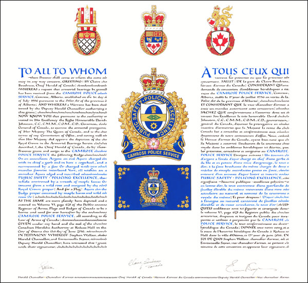 The contents of this Register are intended for research purposes only. The heraldic emblems found in the Register may not be reproduced in any form or in any media without the written consent of the Canadian Heraldic Authority and/or the recipient.