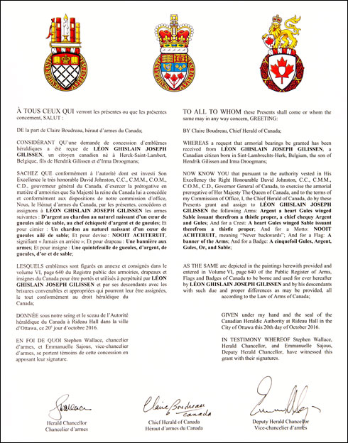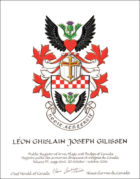 Arms of Léon Ghislain Joseph GilissenBlazonArgent a heart Gules winged Sable issuant therefrom a thistle proper, a chief chequy Argent and Gules; SymbolismWhite represents order and justice, and is thus symbolic of the field to which Mr. Gilissen devoted his career as a police officer. The chequerboard pattern, shown in the colours of Canada, his adopted country, illustrates the multitude and diversity of his ancestors. The heart symbolizes Mr. Gilissen’s love for genealogy, a quest which suggests his forebears migrated to Belgium from Scotland, and from Scandinavia prior to that. The thistle is the emblem of Scotland, while the wings represent both the family’s travels and its ancient Nordic roots, the raven being a recurrent theme in Scandinavian mythology. The combination consisting of a heart with a flower and wings is inspired by other arms used by Gilissen families. There is speculation that the heart was an indication of British origins and that the wings referred to the family’s flight during the turmoil that shook the Spanish Netherlands in the 16th century. |