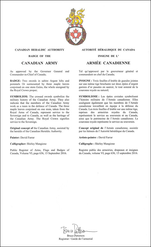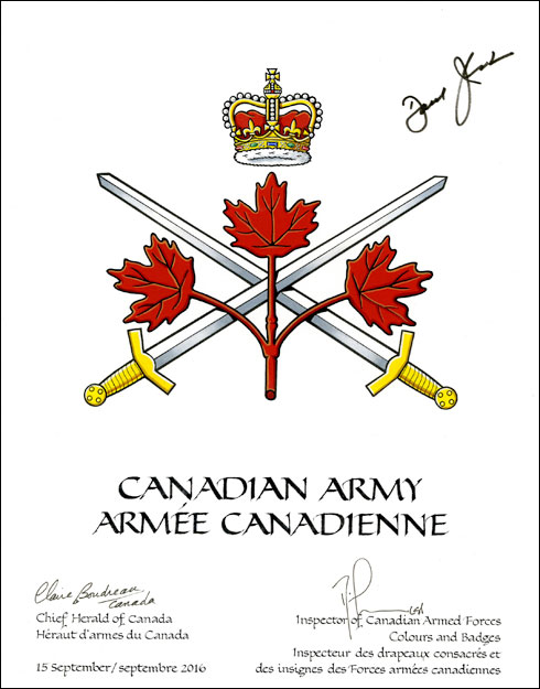 Additional InformationCreator(s)Original concept of the Canadian Army, assisted by the heralds of the Canadian Heraldic Authority. PainterDavid Farrar CalligrapherShirley Mangione Recipient TypeMilitary Institution |