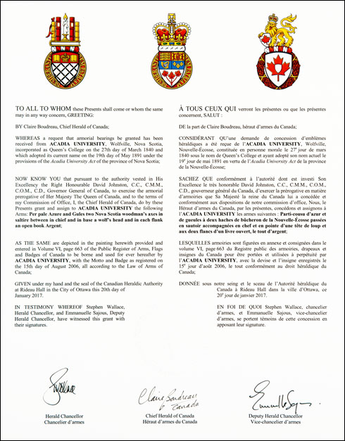 Additional InformationCreator(s)Original concept of the College of Arms, London (1973), and Acadia University. PainterEva Pilar-Cass CalligrapherShirley Mangione Recipient TypeCivil Institution