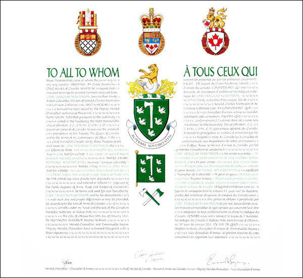 Additional InformationCreator(s)Original concept of Cory Martinson, assisted by the heralds of the Canadian Heraldic Authority. PainterWendy Quirt CalligrapherShirley Mangione Recipient TypeIndividual |