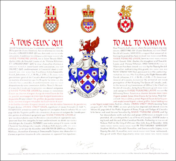 MottoBlazonOMNIA VINCIT AMOR; SymbolismThis Latin phrase meaning “Love conquers all” expresses the devotion with which Ms. Lavoie undertakes her volunteer activities. |