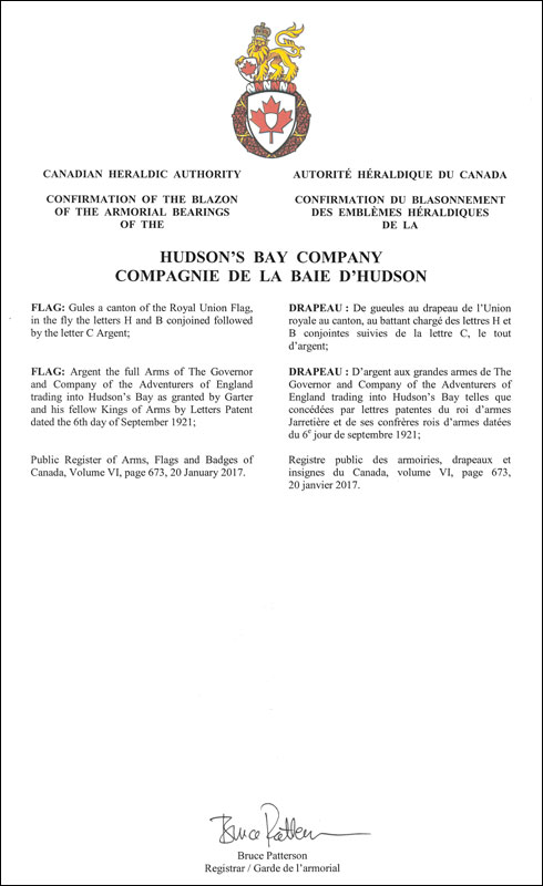 FlagBlazonArgent the full Arms of The Governor and Company of the Adventurers of England trading into Hudson’s Bay as granted by Garter and his fellow Kings of Arms by Letters Patent dated the 6th day of September 1921; SymbolismNot applicable. |