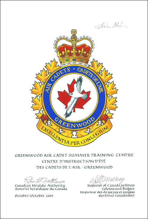 Badge of the Greenwood Air Cadet Summer Training CentreBlazonArgent a maple leaf Gules overall an osprey volant proper, all within an annulus Azure fimbriated and inscribed AIR CADETS • CADETS DE L'AIR in chief and GREENWOOD in base in letters Or; SymbolismThe blue circle with a red maple leaf on a white background recalls the Air Force roundel. The osprey in flight symbolizes reaching for new heights. The location at Greenwood, Nova Scotia, is also represented through the use of this provincial bird. |