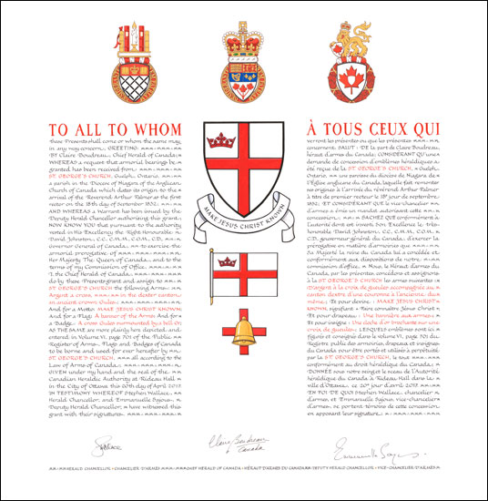Additional InformationCreator(s)Original concept of St. George’s Church (Arms) and Darrel Kennedy, Assiniboine Herald (Badge), assisted by the heralds of the Canadian Heraldic Authority. PainterDesirée Kern CalligrapherDoris Wionzek Recipient TypeCivil Institution