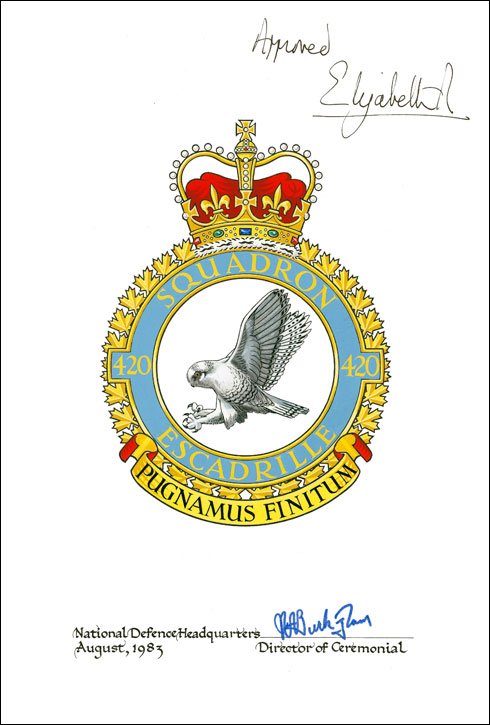 Badge of the 420 Combat Support SquadronBlazonArgent a snowy owl stooping proper; SymbolismThe snowy owl is indigenous to Canada and hunts by night. |