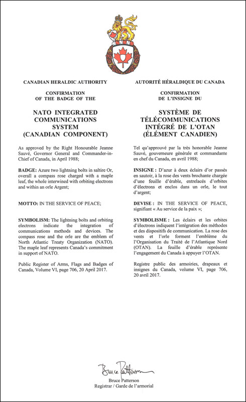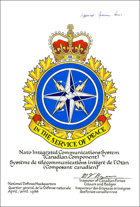 Badge of the NATO Integrated Communications System (Canadian Component)BlazonAzure two lightning bolts in saltire Or, overall a compass rose charged with a maple leaf, the whole interwined with orbiting electrons and within an orle Argent; SymbolismThe lightning bolts and orbiting electrons indicate the integration of communications methods and devices. The compass rose and the orle are the emblem of North Atlantic Treaty Organization (NATO). The maple leaf represents Canada’s commitment in support of NATO. |