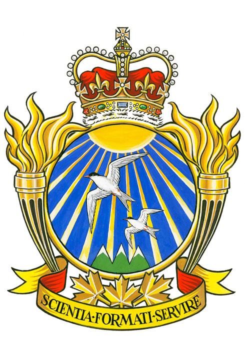 Badge of the Canadian Forces School of Air Reserve TrainingBlazonAzure issuant from the chief a demi-sun in splendour throughout Or, overall two Arctic terns volant proper, issuant from the base three mountains Vert crested Argent; SymbolismThe sun symbolizes the light of knowledge. The terns represent the school’s instructors and students. The mountains allude to the Rocky Mountains visible from Canadian Forces Base Penhold, Alberta, the original site of the school. |