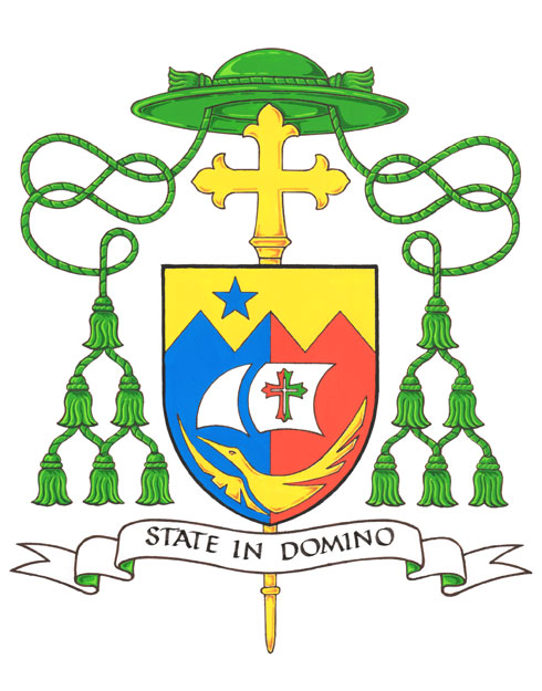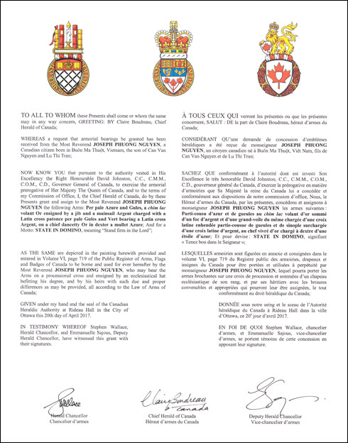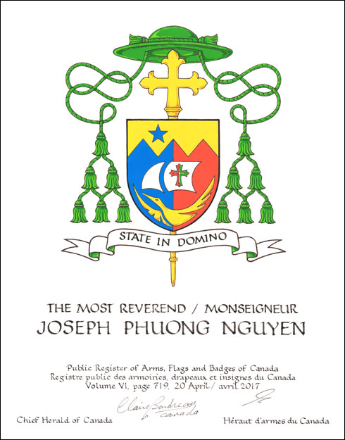 Arms of Joseph Phuong NguyenBlazonPer pale Azure and Gules, a chim lac volant Or ensigned by a jib and a mainsail Argent charged with a Latin cross patonce per pale Gules and Vert bearing a Latin cross Argent, on a chief dancetty Or in dexter a mullet Azure; SymbolismFor Bishop Nguyen, blue represents trust and red represents a strong will, traits that sustained him in his difficult journey from hardship and persecution in Vietnam to his new home in Canada. The chim lac, a mythical bird in Vietnamese folklore, represents Bishop Nguyen’s heritage. As a creature of flight, it also expresses the idea of hope and optimism in embarking on new challenges. The sails convey the idea of a boat, a traditional symbol of the Church. It also serves as a reference to Bishop Nguyen’s escape from Vietnam by boat. The cross on the sail was a symbol created by Bishop Nguyen to represent the church in Canada, its limbs recalling maple leaves, with red symbolizing martyrdom and green restoration and renewal. The star is a symbol of the Blessed Virgin Mary. The peaks represent the dioceses with which Bishop Nguyen has been associated, all in mountainous areas: his home diocese of Ban Mê Thuột in Vietnam; the Archdiocese of Vancouver, where he was ordained and served as a priest; and the Diocese of Kamloops, of which he is now the bishop. They also represent the theological virtues of faith, hope and charity. |