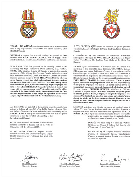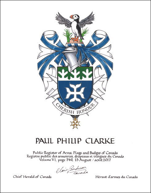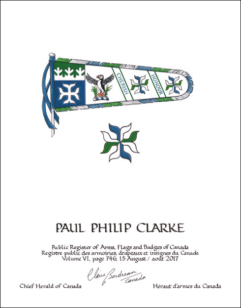 Arms of Paul Philip ClarkeBlazonAzure a cross of four whale tails conjoined Argent, a chief per fess sapinagé Vert and Argent; SymbolismBlue, green and white are the colours of the flag of Labrador, where Mr. Clarke was born. The whale tails make a reference to Atlantic Canada, the region where Mr. Clarke has lived all his life. Their placement in the form of a cross also alludes to the Maltese cross emblem of the Order of St. John, in which Mr. Clarke is Chancellor for the Priory of Canada. The twigs allude to the black spruce twig in the Labrador flag, as well as to environmental stewardship. |